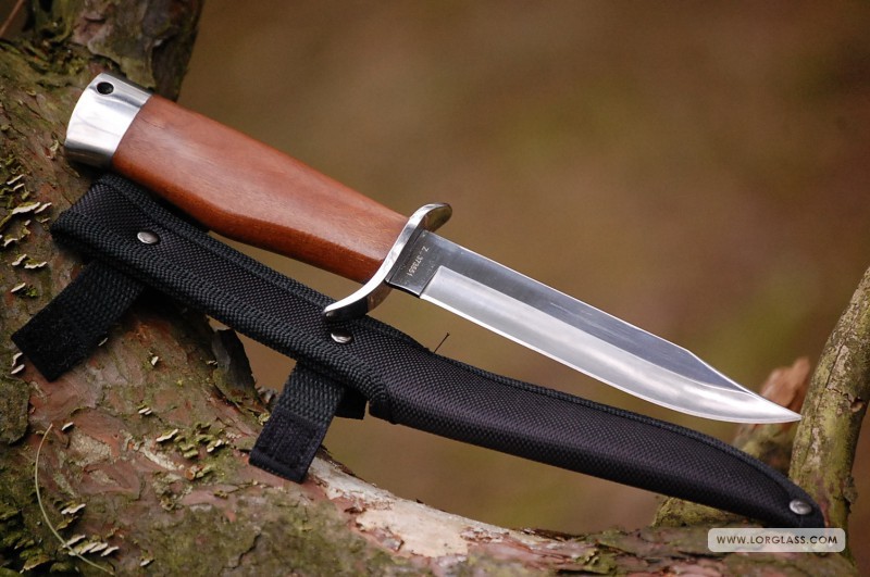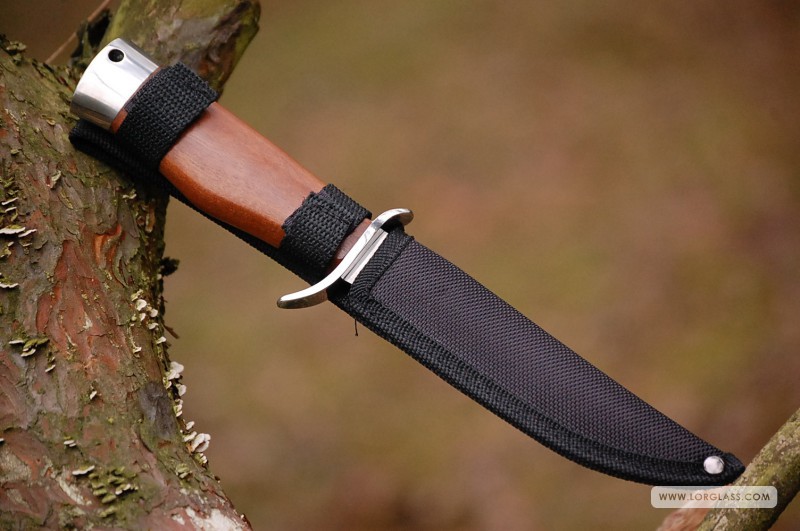Rękojeść wykonana z naturalnego drewna jest na tyle wyprofilowana, że bardzo dobrze dopasowuje się do dłoni użytkownika. Fantazyjnie wygięty jelec podnosi estetykę całości, a przy tym stanowi pewną ochronę przed przypadkowym zsunięciem się dłoni z rękojeści na ostrze. Dodatkowym elementem wyposażenia jest prosta nylonowa pochwa, zapinana na rzepy.