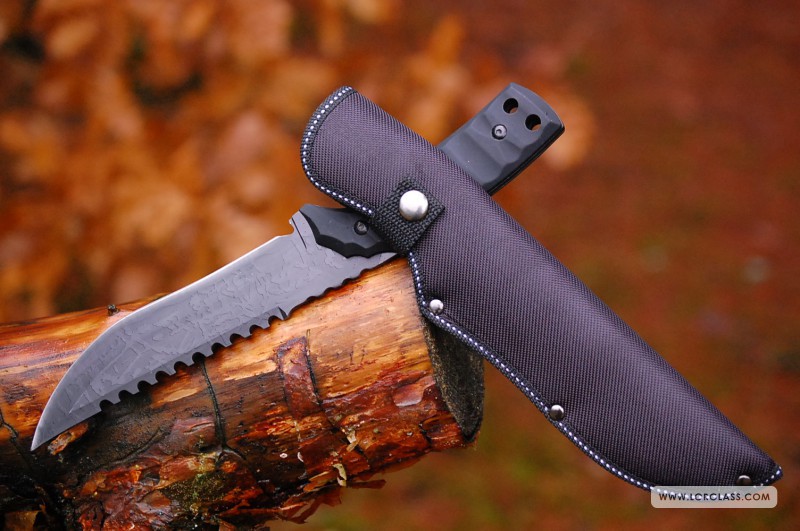 Dodatkowo, w dolnej części rękojeści umiejscowiono dwa otwory umożliwiające przewleczenie linki zabezpieczającej przed przypadkowym wypadnięciem noża z dłoni. Czarne, matowe wykończenie skutecznie eliminuje wszelkiego pochodzenia odblaski i refleksy świetlne.