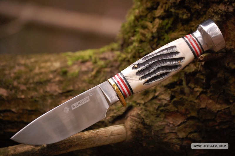Głownia o profilu drop point ze stali 440 o długości 98 mm i grubości aż 5 mm, masywna stalowa głowica, okładziny doskonale wyprofilowanej rękojeści z naturalnej kości zapewniającej pewny chwyt, przymocowane do trzpienia mosiężnymi nitami, idealnie komponującymi się z niewielkim, ale doskonale spełniającym swe zadanie również mosiężnym jelcem, to największe zalety tego noża.